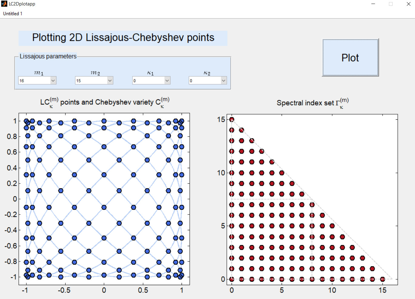 - LC2Ditp: A software package that contains a Matlab implementation for 2D polynomial interpolation on Lissajous-Chebyshev points. Additionally, the two standalone apps LC2Dfevalapp and LC2Dplotapp are included to demonstrate the capabilities of the package.