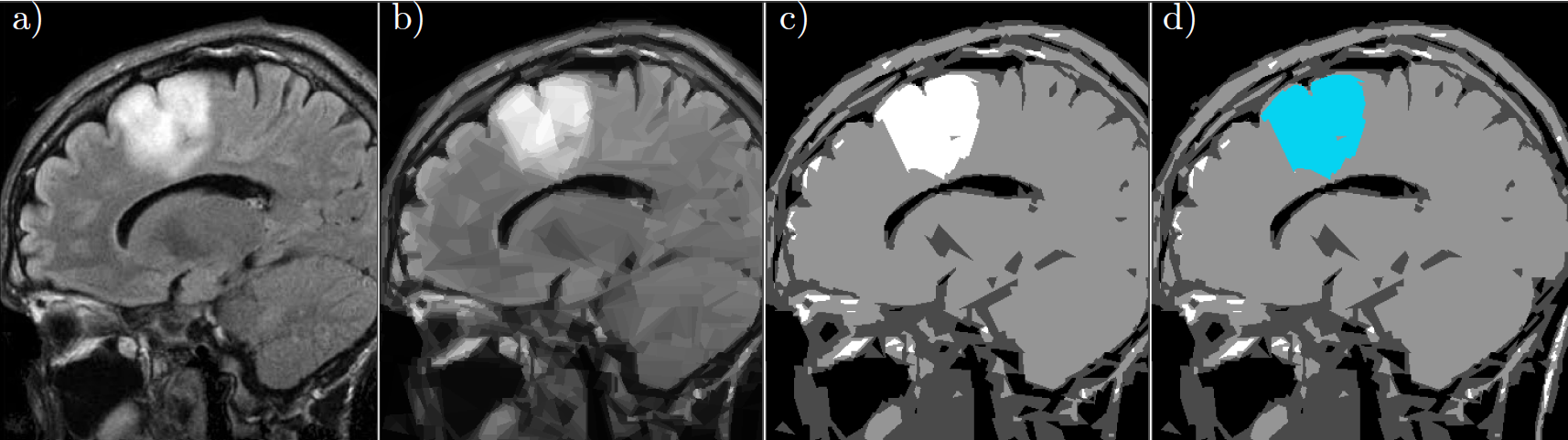 Fig. 6: Wedgelet split-and-merge segmentation for biomedical images: a) Original MRI image with glioma b) Wedgelet split into $2500$ regions c) Segmentation obtained by merging the wegdgelet regions d) Blue colored segmented glioma