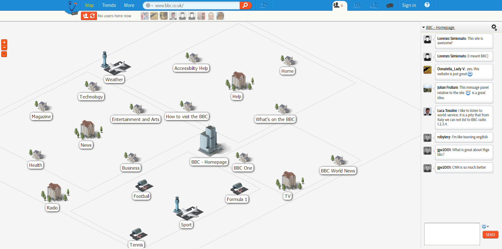 | The technology side: With Volunia I have tried to shake the technology world by changing the way we see and navigate the web (each web site is viewed under a city metaphor, and the navigation model becomes visual and much more informative), and how we socially interact with people during our search and navigation process. It's been an amazing technical journey, building world-wide big data systems from scratch, developing innovative algorithms, interfaces, server backends, industrial-scale performance systems, social analysis, real-time massive data handling, and a wealth of other topics. This new multi-million dollar social search engine, built for world-wide audience and localized into the 12 main planet languages, has stirred huge interest and media impact all over the world already in its public beta phase. For descriptions of the Volunia project (in its first stage of development), see for example: